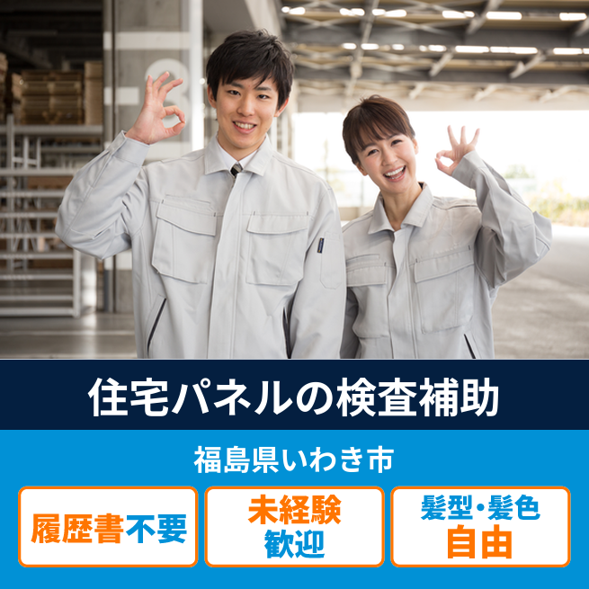 給与詳細 月収例 240,000円 日給例 12,000円 勤務地 福島県いわき市 仕事内容 住宅用パネル製造