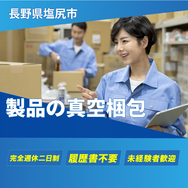 給与詳細 月収例 230,100円 時給例 1,180円 勤務地 長野県塩尻市 仕事内容 製品出荷業務(梱包、運搬、ピッキング等)、真空梱包(袋詰め、ラベル貼り等)、検査委託品の箱詰め、簡単なPC入力(数量、アルファベット文字列)。