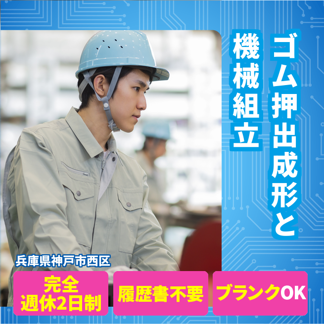 給与詳細 月収例 208,000円 日給例 10,400円 勤務地 兵庫県神戸市西区 仕事内容 汎用ゴムの検査、ゴムの押し出し機を使用した押出成形作業