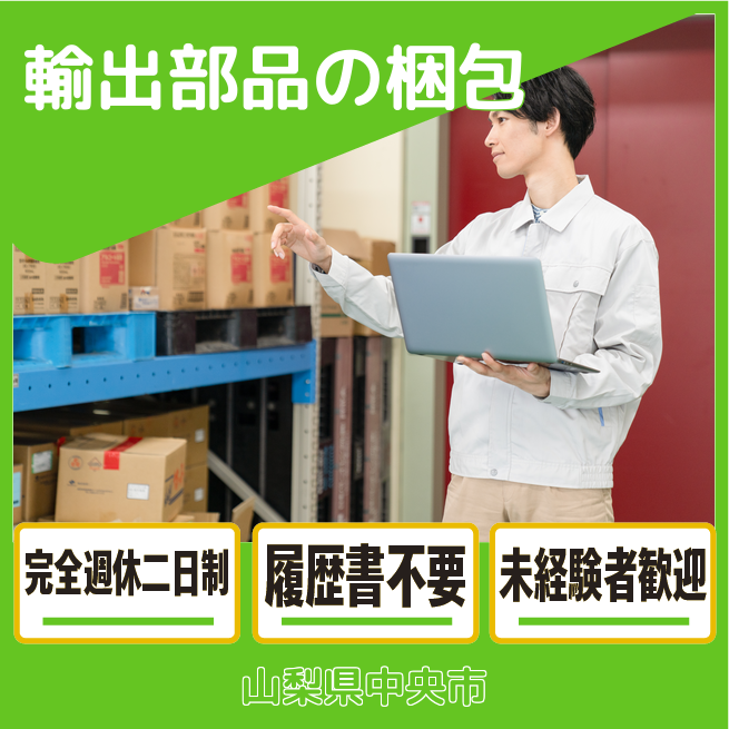 給与詳細 月収例 180,000円 時給例 1,200円 勤務地 山梨県中央市 仕事内容 輸出部品の梱包及び、付帯業務