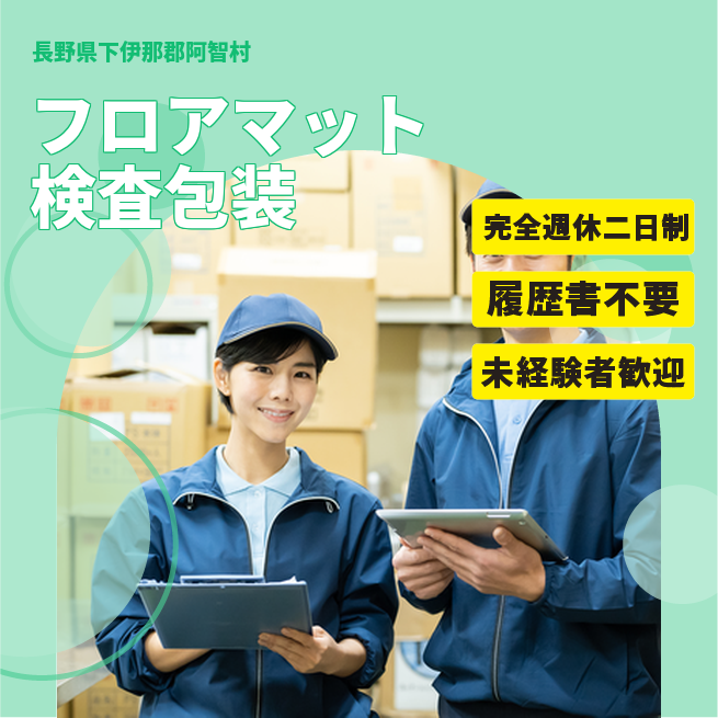 給与詳細 月収例 226,000円 日給例 11,300円 勤務地 長野県下伊那郡阿智村 仕事内容 【フロアマット検査包装】