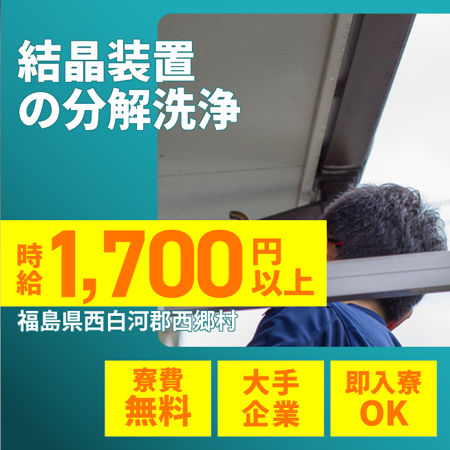 給与詳細 月収例 272,000円 時給例 1,700円 勤務地 福島県西白河郡西郷村 仕事内容 半導体を製造している会社で結晶製造装置の分解や洗浄、再組立したり、材料の準備などをおまかせします♪簡単なPC入力もあり!