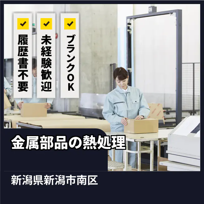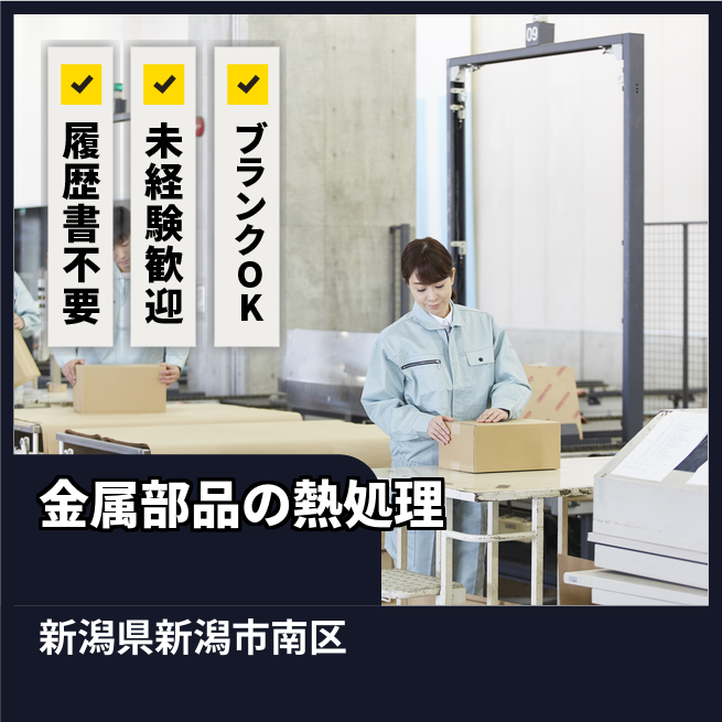 金属部品の熱処理(セット・取出し・検査)。増員募集の安定案件。