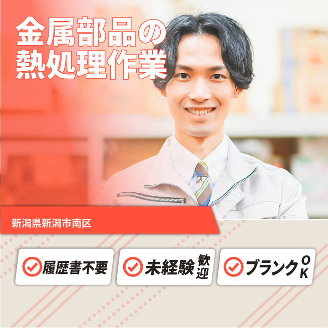 金属部品の熱処理工程で、セット~取り出し~検査を担当するお仕事です。