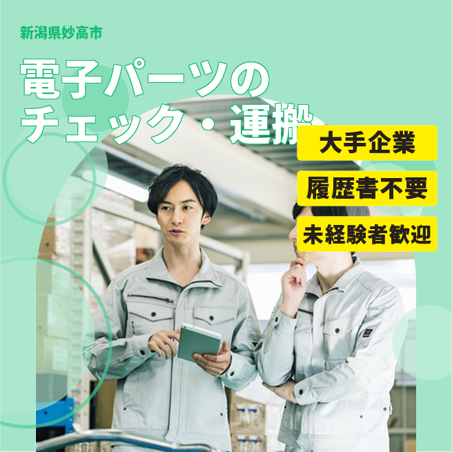 給与詳細 月収例 240,000円 日給例 12,000円 勤務地 新潟県妙高市 仕事内容 半導体製造工場での機械オペレーター作業(クリーンルーム)
