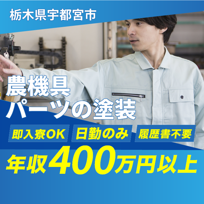 給与詳細 年収例 4,205,376円 月収例 350,448円 勤務地 栃木県宇都宮市 仕事内容 農機具本体の組立、部品の加工、塗装工程など、適正に応じて配属が決まります。