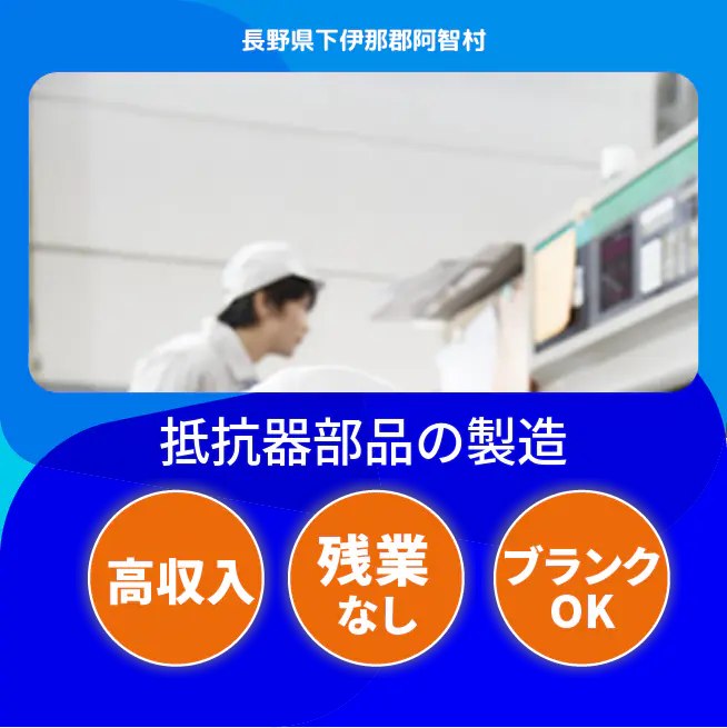 給与詳細 月収例 273,000円 日給例 11,200円 勤務地 長野県下伊那郡阿智村 仕事内容 【業務内容】抵抗器部品の製造に関わる機械操作や検査、梱包作業を担当します。