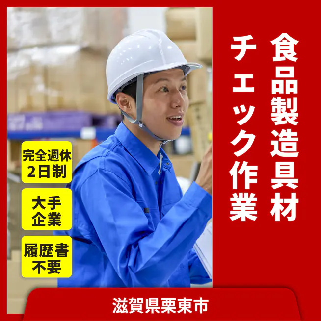 給与詳細 月収例 273,000円 日給例 11,200円 勤務地 滋賀県栗東市 仕事内容 【食品製造具材チェック作業】