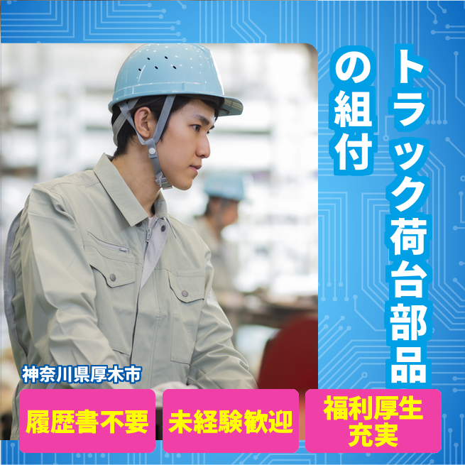 給与詳細 月収例 240,000円 日給例 12,000円 勤務地 神奈川県厚木市 仕事内容 荷台の製造、部品の組み付け、検査、その他付随業務。