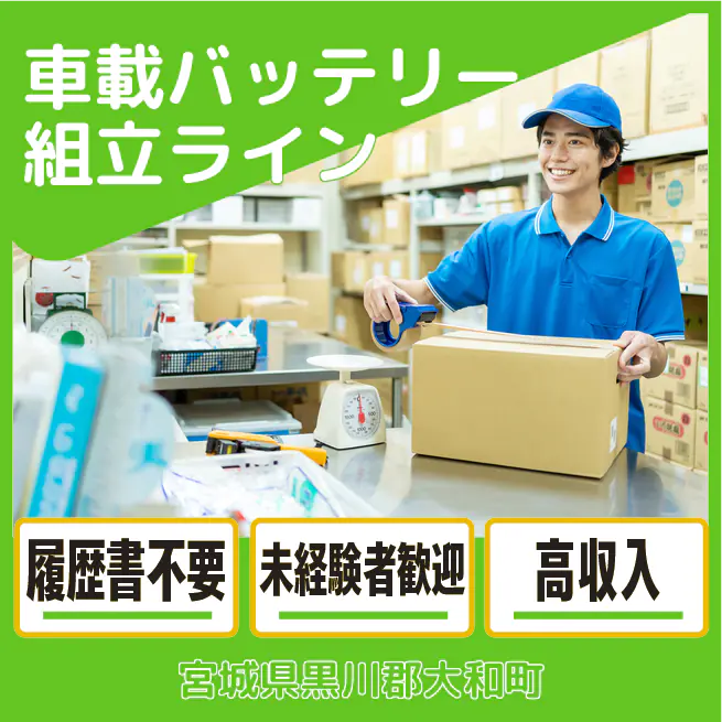 給与詳細 月収例 260,000円 日給例 13,000円 勤務地 宮城県黒川郡大和町 仕事内容 【車載バッテリー組立ライン】