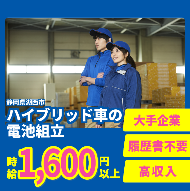 企業 トヨタバッテリー 給与詳細 月収例 300,000円 時給例 1,600円 勤務地 静岡県湖西市 仕事内容 ハイブリッド自動車用電池の製造業務のお仕事です。
