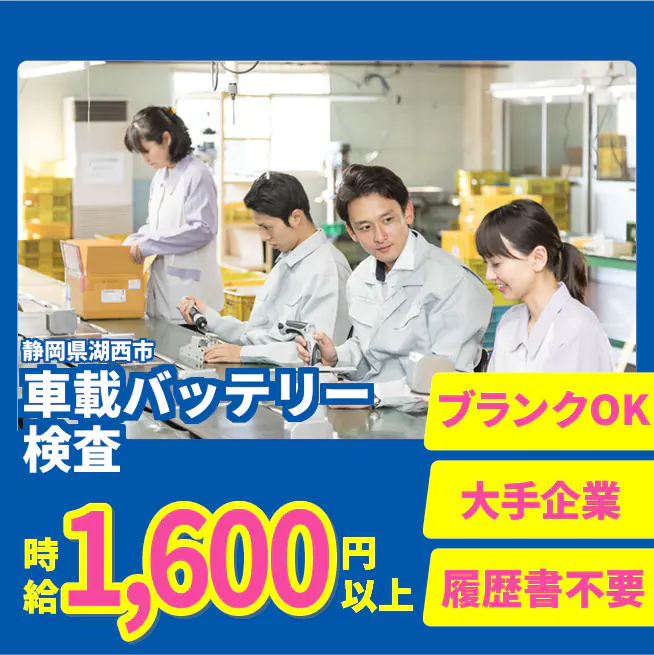 企業 トヨタバッテリー 給与詳細 月収例 300,000円 時給例 1,600円 勤務地 静岡県湖西市 仕事内容 【業務内容】