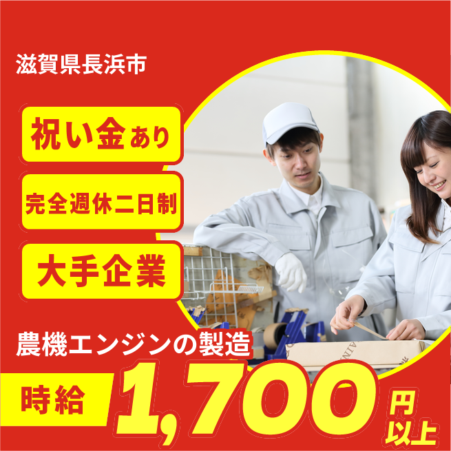 給与詳細 年収例 4,200,000円 月収例 350,000円 勤務地 滋賀県長浜市 仕事内容 ~トラクター等の農業機械で使用されるエンジン製造~