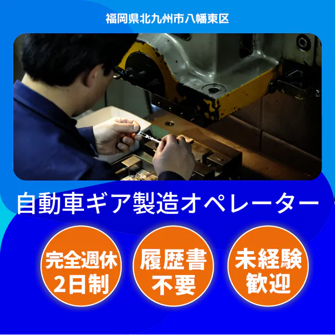 給与詳細 月収例 270,000円 日給例 13,500円 勤務地 福岡県北九州市八幡東区 仕事内容 (1)成形:成形前後の部品の運搬、台車移動(2)組付:合成樹脂製品にパーツを組付ける作業
