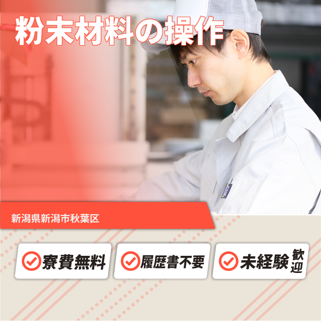 給与詳細 月収例 220,000円 日給例 11,000円 勤務地 新潟県新潟市秋葉区 仕事内容 触媒や化学材料の製造工場で、機械オペレーターとして製造設備の操作・監視を担当します。原料の投入や撹拌・加熱・乾燥・成型などの工程を管理し、製品の状態確認や異常の早期発見・報告も行います。自動制御装置や計器のチェックを通じて、製造工程全体の安定と安全を守る役割です。