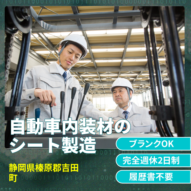 給与詳細 月収例 250,000円 日給例 12,500円 勤務地 静岡県榛原郡吉田町 仕事内容 車輌内装材シートの製造に関わる業務です。