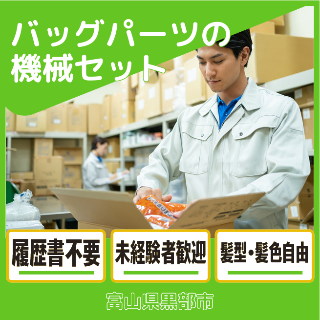 給与詳細 月収例 240,000円 日給例 12,000円 勤務地 富山県黒部市 仕事内容 ファスナーの部品製造