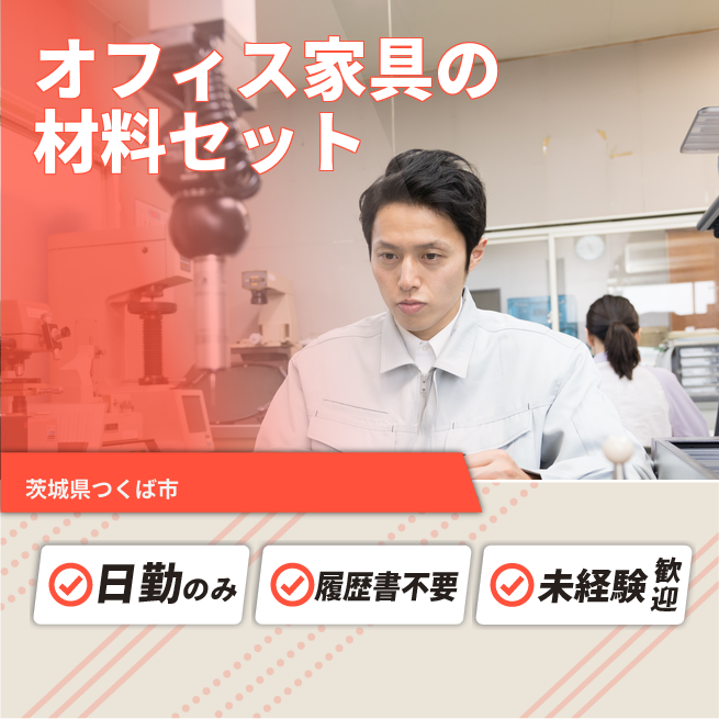 給与詳細 月収例 220,000円 日給例 11,000円 勤務地 茨城県つくば市 仕事内容 オフィス家具製造工場での業務