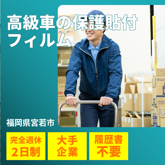 給与詳細 月収例 200,000円 日給例 10,000円 勤務地 福岡県宮若市 仕事内容 大手自動車メーカーでの高級車に完成車の保護フィルム貼り業務。ラップの様な保護フィルムを車のボンネットや天井に貼り、空気を抜く作業。