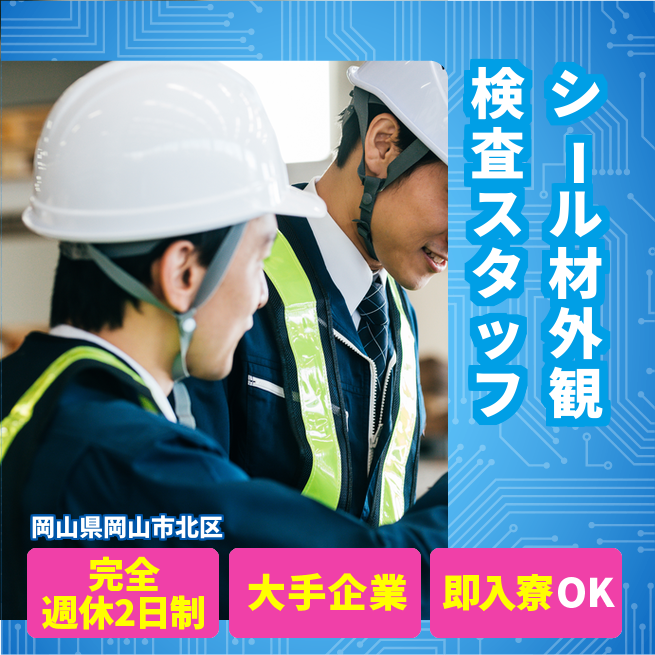 給与詳細 月収例 200,000円 日給例 10,000円 勤務地 岡山県岡山市北区 仕事内容 【シール材外観検査スタッフ】
