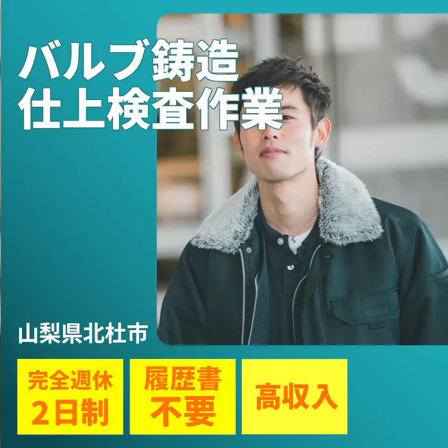 給与詳細 月収例 217,000円 日給例 10,850円 勤務地 山梨県北杜市 仕事内容 【バルブ鋳造仕上検査作業】