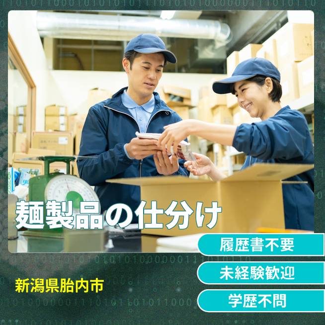 給与詳細 月収例 204,750円 時給例 1,050円 勤務地 新潟県胎内市 仕事内容 調理麺の製造、包装、トッピング等を行って頂きます。