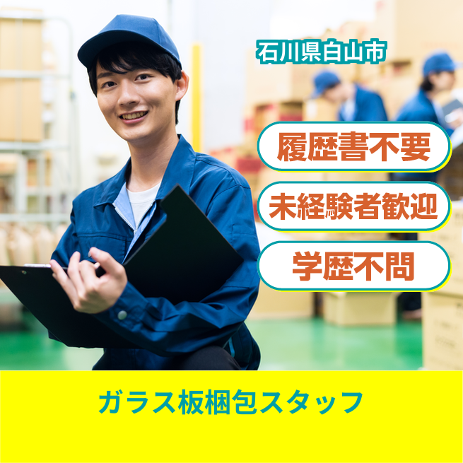 給与詳細 月収例 250,000円 日給例 12,500円 勤務地 石川県白山市 仕事内容 【ガラス板梱包スタッフ】