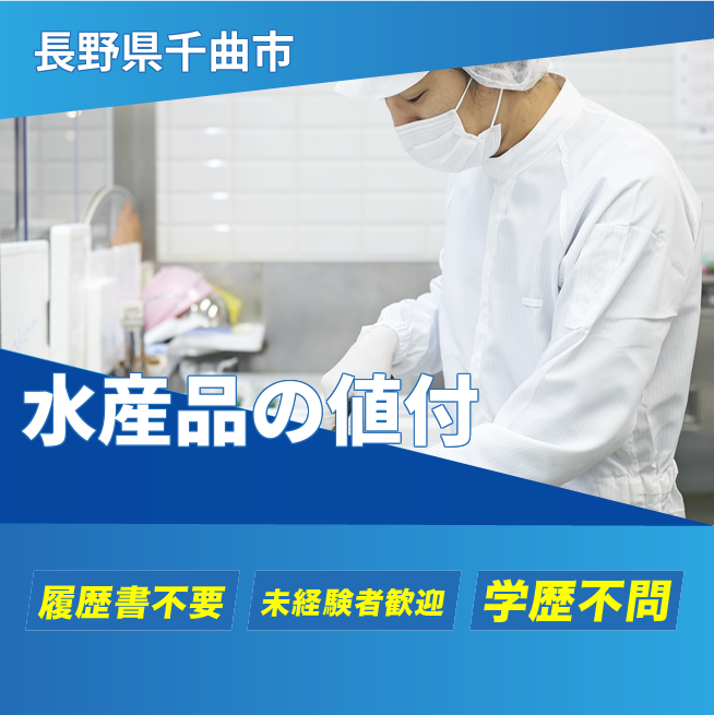 給与詳細 月収例 120,000円 時給例 1,250円 勤務地 長野県千曲市 仕事内容 スーパーの水産コーナーへ出す刺身等のパックへの盛り付け、ラップ掛け、品出しのお仕事。クリーンスーツ着用。