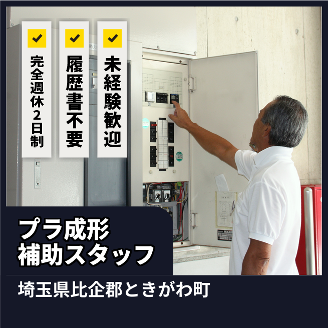 給与詳細 月収例 247,650円 日給例 10,160円 勤務地 埼玉県比企郡ときがわ町 仕事内容 【プラ成形補助スタッフ】