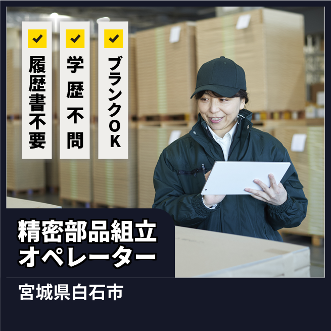 給与詳細 月収例 200,000円 日給例 10,000円 勤務地 宮城県白石市 仕事内容 【精密部品組立オペレーター】
