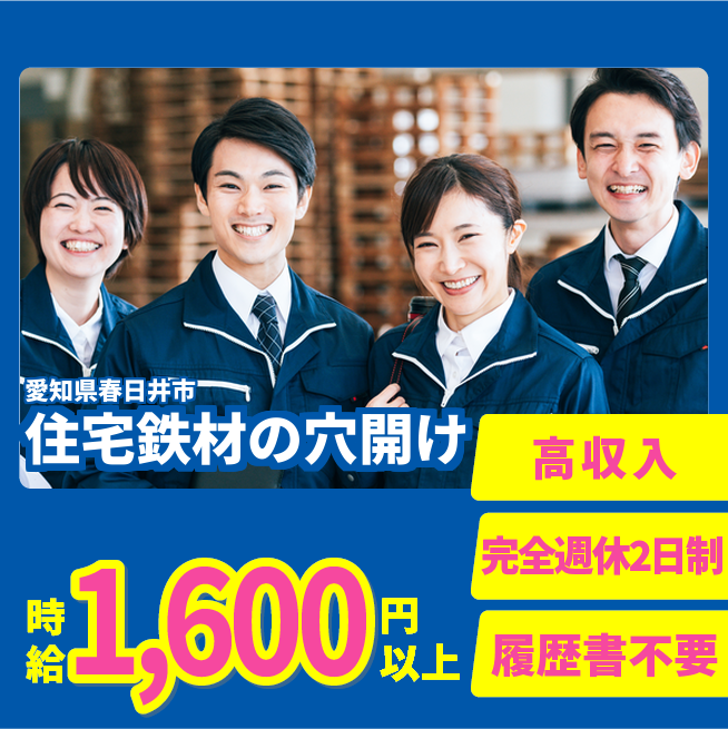 給与詳細 月収例 290,000円 時給例 1,650円 勤務地 愛知県春日井市 仕事内容 住宅部材の鉄材の穴あけ、ビス留め作業などを行います。
