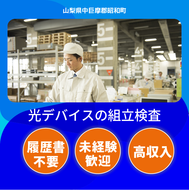 給与詳細 月収例 302,250円 日給例 12,400円 勤務地 山梨県中巨摩郡昭和町 仕事内容 光デバイス製品のパイロット試験・チップ選別・評価・外観検査