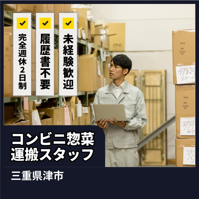 給与詳細 月収例 200,000円 日給例 10,000円 勤務地 三重県津市 仕事内容 【コンビニ惣菜運搬スタッフ】