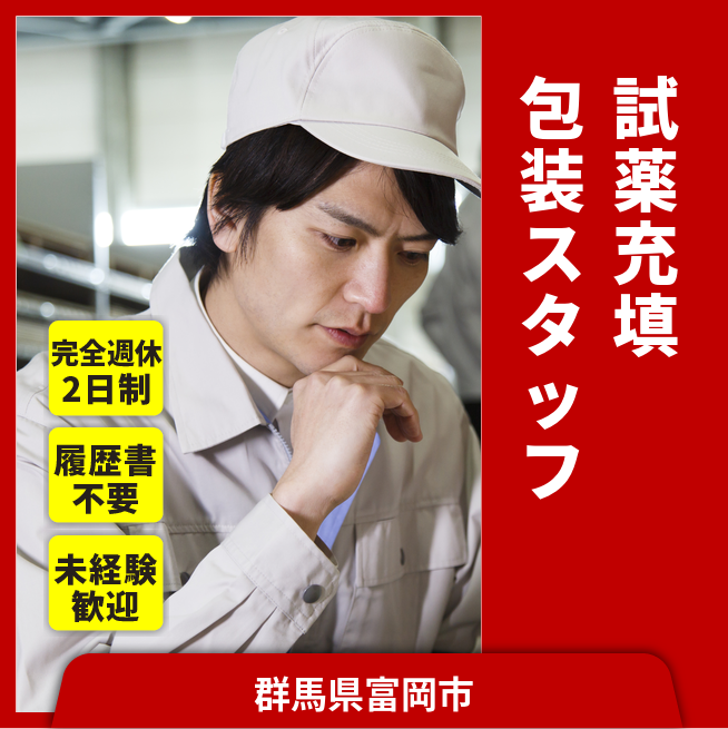 給与詳細 月収例 180,000円 時給例 1,170円 勤務地 群馬県富岡市 仕事内容 【試薬充填包装スタッフ】