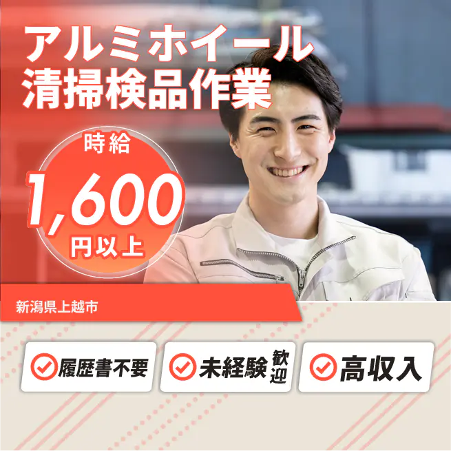 給与詳細 月収例 238,000円 時給例 1,600円 勤務地 新潟県上越市 仕事内容 【アルミホイール清掃検品作業】