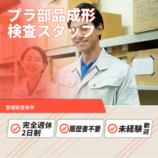 給与詳細 月収例 190,000円 時給例 1,100円 勤務地 宮城県登米市 仕事内容 【プラ部品成形検査スタッフ】