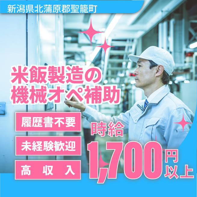 給与詳細 月収例 331,500円 時給例 1,700円 勤務地 新潟県北蒲原郡聖籠町 仕事内容 米飯の製造に係るオペレーター補助(3交替)