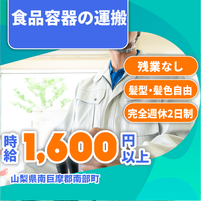 給与詳細 月収例 270,000円 時給例 1,630円 勤務地 山梨県南巨摩郡南部町 仕事内容 容器の