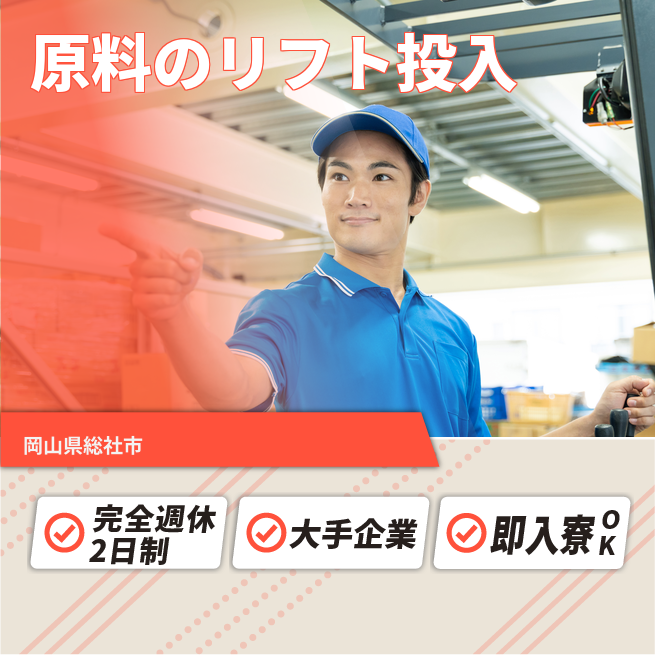 給与詳細 月収例 263,250円 日給例 10,800円 勤務地 岡山県総社市 仕事内容 飲料メーカーでのお仕事です!