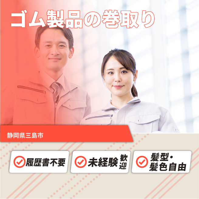 給与詳細 月収例 264,000円 日給例 13,200円 勤務地 静岡県三島市 仕事内容 自動車用の生タイヤを自動機にセットするお仕事です!タイヤ製造工程の中で押出工程の部署です。