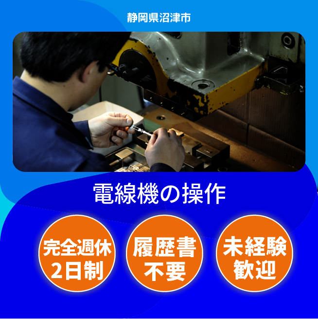 給与詳細 月収例 219,300円 日給例 10,965円 勤務地 静岡県沼津市 仕事内容 簡単な機械操作で電線を製造するお仕事です!