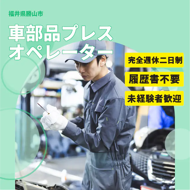 給与詳細 月収例 188,800円 時給例 1,180円 勤務地 福井県勝山市 仕事内容 【車部品プレスオペレーター】