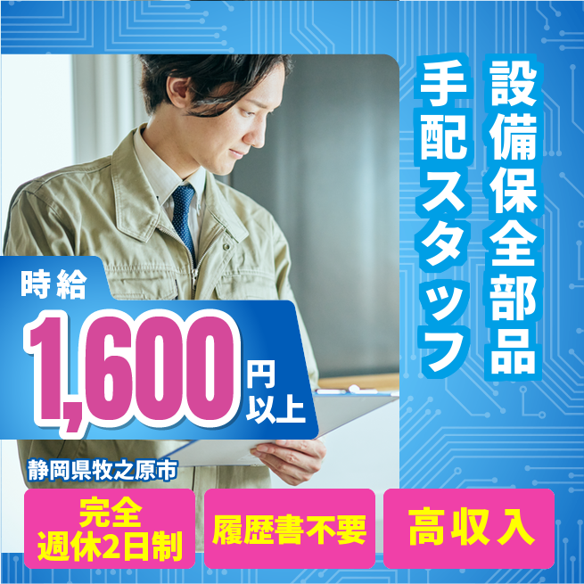 給与詳細 月収例 300,000円 時給例 1,650円 勤務地 静岡県牧之原市 仕事内容 【設備保全部品手配スタッフ】