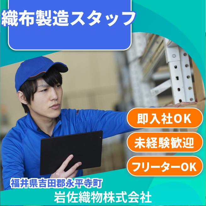次世代の中心を担える方、製造業でのスキルを身に着けたいという意欲をお持ちの方からの積極的なご応募をお待ちしております。 企業名 岩佐織物株式会社正社員求人