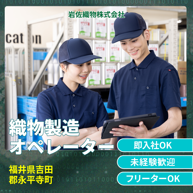 次世代の中心を担える方、製造業でのスキルを身に着けたいという意欲をお持ちの方からの積極的なご応募をお待ちしております。 企業名 岩佐織物株式会社正社員求人