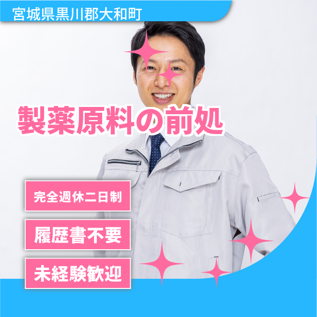 給与詳細 月収例 190,000円 時給例 1,150円 勤務地 宮城県黒川郡大和町 仕事内容 製薬工場での原材料の前処理・混合・洗浄などの作業です(クリーンルームでのお仕事です)