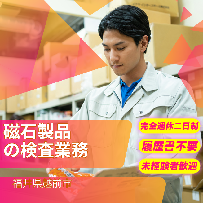 給与詳細 月収例 198,000円 時給例 1,180円 勤務地 福井県越前市 仕事内容 【業務内容】製品の目視検査と機械セット作業