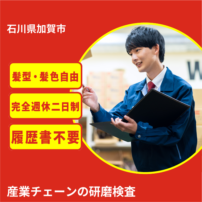 給与詳細 月収例 200,000円 日給例 10,000円 勤務地 石川県加賀市 仕事内容 機械の下においてある箱を検査場に持っていき、中に入っているチェーン用の部品(小指の先~手のひらサイズまで)を研磨機にかけます。その後圧力測定機に乗せ、強度チェック、サイズ測定をし、記入表に記入します。