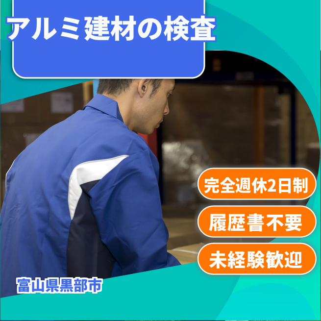 給与詳細 月収例 198,000円 時給例 1,250円 勤務地 富山県黒部市 仕事内容 住宅用アルミ建材の運搬・加工・部品付・検査・包装業務