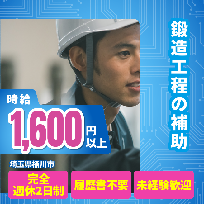 給与詳細 月収例 300,000円 時給例 1,600円 勤務地 埼玉県桶川市 仕事内容 主に熱間工程の製造業務です。鍛造機、圧延機など当工場でも大型の製造設備を使用する工程。最初は補助作業から開始し、最終的には鋳造設備のオペレーターに従事
